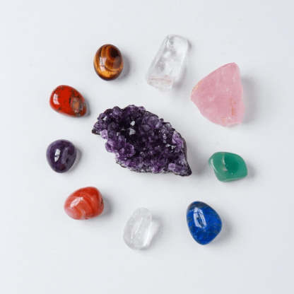 Crystal Box - Set of 7 Chakra Stones, Rose Quartz & Amethyst Cluster